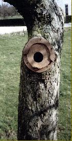 Réduction de cavités naturelles dégradées. Dans les vieux arbres, les cavités à « Chevêches » s'ouvrent avec l'âge laissant ainsi l'eau et la lumière pénétrer à l'excès. Ces gîtes naturels sont alors abandonnés obligeant les oiseaux à déménager vers d'autres horizons. Le dispositif décrit ci-dessus permet de rétrécir l'entrée des trous tout en permettant à l'ornithologue d'y passer le bras et d'aller y chercher les oiseaux pour les baguer. Il est réalisé en multiplex << lauan >> de 10 à 12 mm d'épaisseur, collage marin ( appelé chez nous W.B.P. )Les pièces sont découpées à la scie sauteuse. Le principe en est simple : une plaque amovible contenant le trou de 7 à 7.5 cm ( trou de passage de la chevêche ) s'emboîte dans la plaque couvrant le trou de l'arbre (+/- 16 cm minimum) Des morceaux découpés en arc de cercle seront collés sur le dessus de la plaque non amovible afin d'assurer l'étanchéité de la partie amovible. Une petite vis placée en dessous du petit perchoir situé sous le trou d'entrée de 7.5 cm empêche la plaque amovible de glisser . Tout le dispositif sera fixé au moignon de l'arbre par vissage (visseuse batterie). Le moignon sera rectifié (tronçonneuse - scie) afin d'être bien plat pour recevoir le rétréciceur et sera enduit d'un mastic silicone pour assurer l'étanchéité Bon travail. Conception et texte : S. Huybrechts Photo : J. Bultot,Th.Votquenne Plan et mise en page : N. Marres |